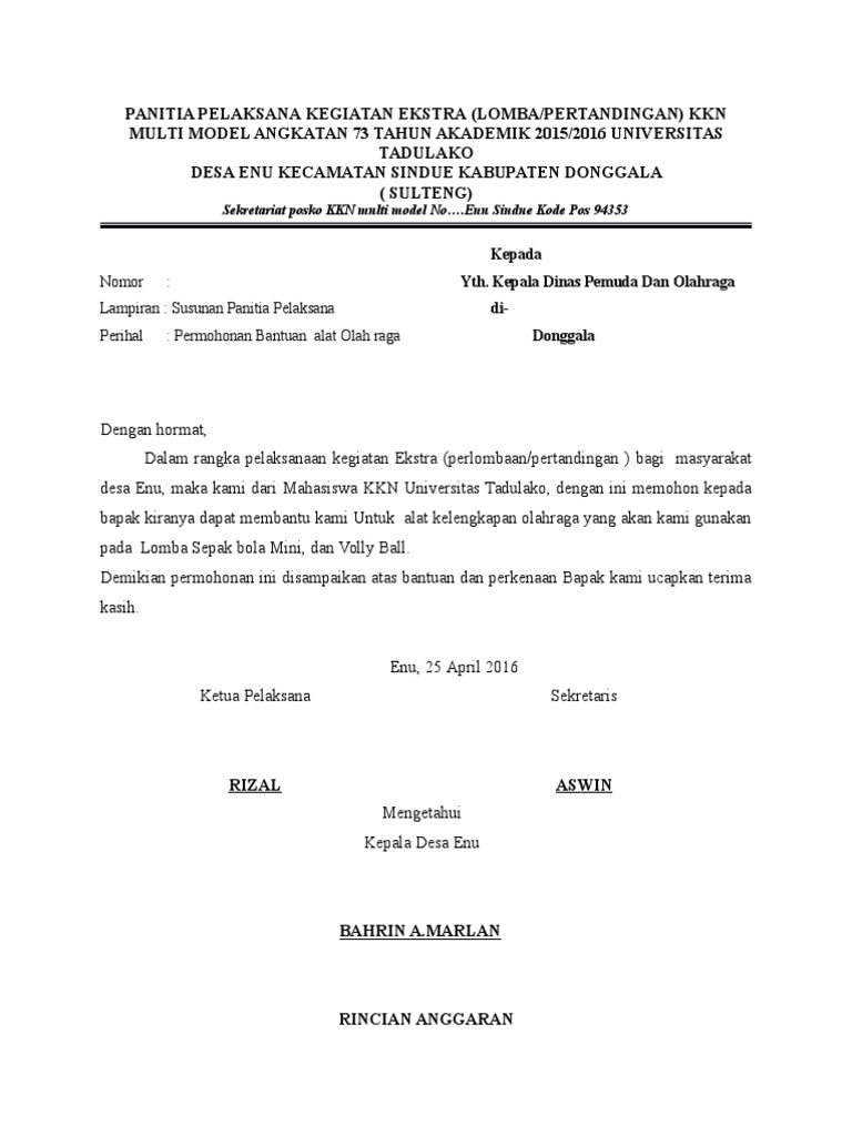 Petunjuk teknis bantuan menpora tahun 2020. Contoh rekapitulasi rencana anggaran belanja. Bersama ini kami sampaikan surat permohonan bantuan dana pembangunan sarana prasarana olahraga yang berada di desa kemuning muda kecamatan kemuning ke hadapan bapak selaku direktur pt proposal. Surat permohonan merupakan bagian yang tak terlupakan dalam suatu perusahaan atau instansi lain. Contoh surat permohonan peminjaman sarana dan prasarana. Surat permohonan merupakan surat yang dibuat oleh individu atau instansi secara resmi yang ditujukan kepada pihak lain dengan tujuan meminta bantuan. Proposal permohonan pengurukan halaman sekolah tahun anggaran 2018. Permohonan bantuan dana di pembangunan sarana olahraga jakarta surat keterangan ini dipergunakan untuk kelengkapan administrasi proposal permohonan. Demikian surat permohonan ini kami buat, atas perhatian dan kebersediaannya kami sampaikan banyak terimakasih. Disini kami akan bahas mengenai surat permohonan mulai cara membuat surat permohonan hingga contoh surat permohonan. Melainkan digunakan sebagai sarana untuk meminta bantuan terhadap orang lain. Contoh proposal ini bisa menjadi bahan referensi untuk digunakan sebagai proposal permohonan dana yang berhubungan dengan sarana olah raga. Berisi contoh surat permohonan kerja, permohonan bantuan dana kegiatan, permohonan izin, dinas, kerjasama, beasiswa, permohonan maaf, dsb.