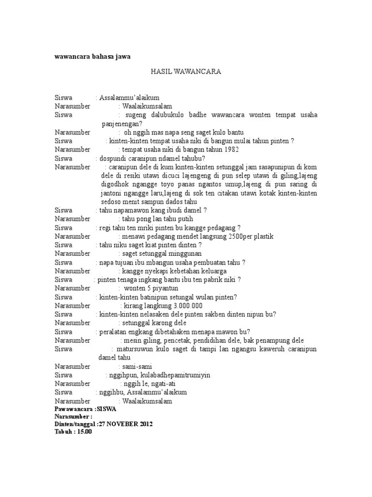 Ngripta kahanan sing nyenangake saengga wong kang diwawancarai seneng manngsuli pitakonan d. Arti penyusunan laporan penyusunan laporan adalah suatu kegiatan yang biasa dilakukan di dalam lingkungan suatu pekerjaan. Inilah pembahasan selengkapnya mengenai contoh teks laporan hasil kegiatan dalam bahasa jawa. Bentuknya berisi sebuah cerita yang memiliki berbagai alur cerita. struktur teks laporan kegiatan sing runtut yaiku. 7 contoh teks deskripsi singkat dalam berbagai kasus lengkap. teks editorial merupakan pandangan redaktur penerbitan pers yang berkaitan dengan nilai moral dan hati nurani. Bait utawa pada kang ana ing geguritan uga dadi beda antarane. Rawa pening, roro jonggrang, banyuwangi sage yaiku crita rakyat sing ana gegayutane marang sejarah, nyritakake bab kepahlawanan, kesaktian sawijining pawongan. Unsur basa teks wawancara a. Centralpendidikan.com | pada kesempatan kali ini, kami akan membagikan contoh soal latiha soal pas bahasa jawa smp kelas 8 semester 1 tahun pelajaran 2020/2021 online. struktur dasar drama tahukah kamu bahwa sebuah teks drama pada intinya memiliki struktur dasar. wawancara kliling/jalanan (man in the street interview), yaiku wawancara kang ditindakake wartawan ngubungi sadhengah interview kang mapane pisah,kang antarane siji lansijine ana.